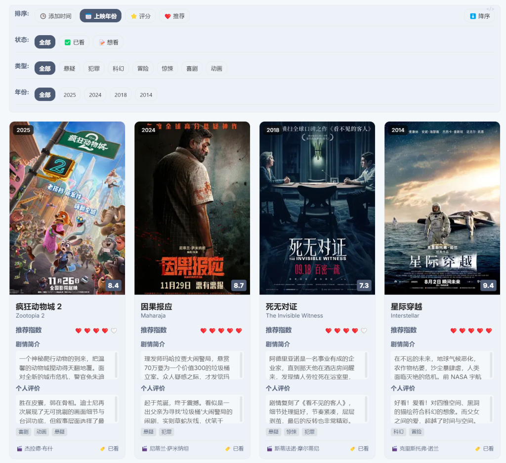 - 双重评分:同时展示“豆瓣评分”(大众参考)和“个人推荐”(私人喜好)。