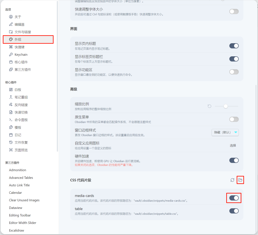 设置->外观->CSS 代码片段。 - 点击右侧的文件夹图标,打开 snippets 文件夹。